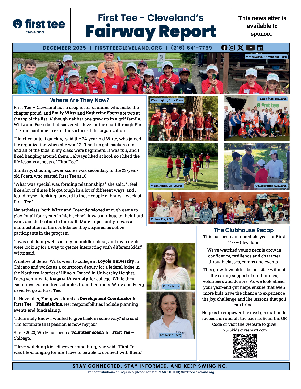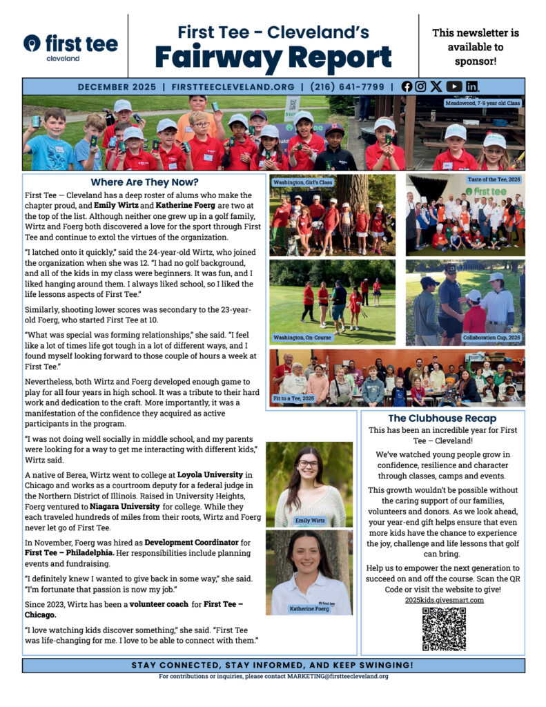 First Tee — Cleveland is excited to publish its monthly newsletter, Fairway Report, as a vehicle to share all of the ways the organization enriches the lives of youth in our community through golf. The goal is for the newsletter to hit your email inbox every month. You can find a digital version of our newsletter under this “Stories” section of our website. Thanks to volunteer coach Matt Harness for assisting with the writing!